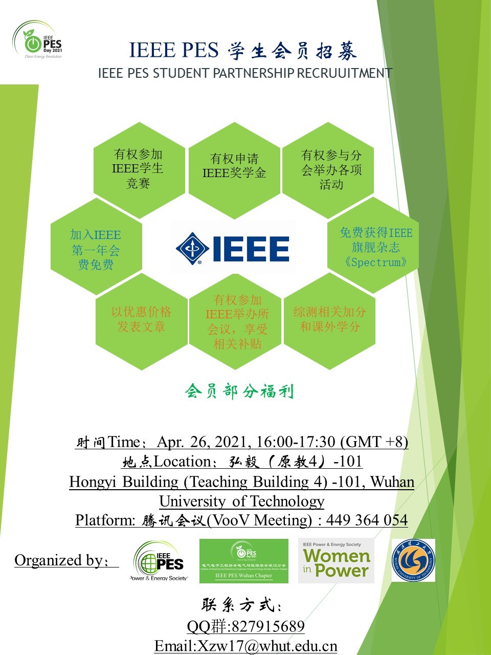 4月26日周一下午16:00,IEEE PES武理学生会员招募将在弘毅(原教4)-101开展宣讲招募活动,活动线上同步(腾讯会议ID:449 364 054)。